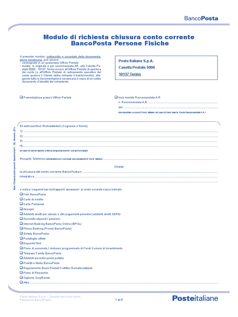 Lettera per chiudere conto corrente. Voltura | Servizio Elettrico Nazionale Uso della fornitura nel caso di contratto per usi diversi da abitazione. Eventuali coordinate del conto corrente bancario/postale (nominativo e codice fiscale dell'intestatario del conto e codice IBAN). Per i contratti uso domestico, scegliendo una qualsiasi forma di domiciliazione delle bollette (BANCARIA/POSTALE), non viene addebitato il ... Chiusura Conto Corrente: Costi e Procedura da Seguire! La lettera per chiusura conto corrente deve essere inviata tramite raccomandata con ricevuta di ritorno. Nella busta devi inserire, oltre che l'apposito modulo, come per esempio il modulo chiusura conto corrente CheBanca, ... Come chiudere un conto corrente in caso di decesso. Fac Simile Richiesta Estinzione Conto corrente - Moduli Editabili La lettera deve essere alla Banca e risulta essere necessario inserire tutti i dati del conto corrente da chiudere, come il titolare e l'IBAN. Risulta essere importante anche allegare tutte le carte e il libretto degli assegni. Visto che però tali oggetti hanno elevata importanza, bisogna renderli inutilizzabili tagliandoli. PDF Modulo Di Richiesta Chiusura Conto Corrente Bancoposta Persone Fisiche DOPO LA CHIUSURA DEL CONTO. Nel caso in cui si desideri chiudere il conto e procedere successivamente al reintegro del saldo negativo che dovesse risultare in seguito ai conteggi di chiusura conto, potrà restituire l'importo dovuto sul conto corrente n. 97219000 intestato a "Poste Italiane S.p.A.- Divisione Servizi Finanziari