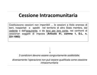 PDF Le cessioni intracomunitarie CESSIONI INTRACOMUNITARIE NON IMPONIBILI ART. 41, CO. 1, D.L. N. 331/93 Costituiscono cessioni intracomunitarie non imponibili, le cessioni a titolo oneroso di beni, originari della Comunità o ivi ammessi in libera pratica a condizione che: a. I beni siano trasportati o spediti, dal cedente o dall'acquirente o