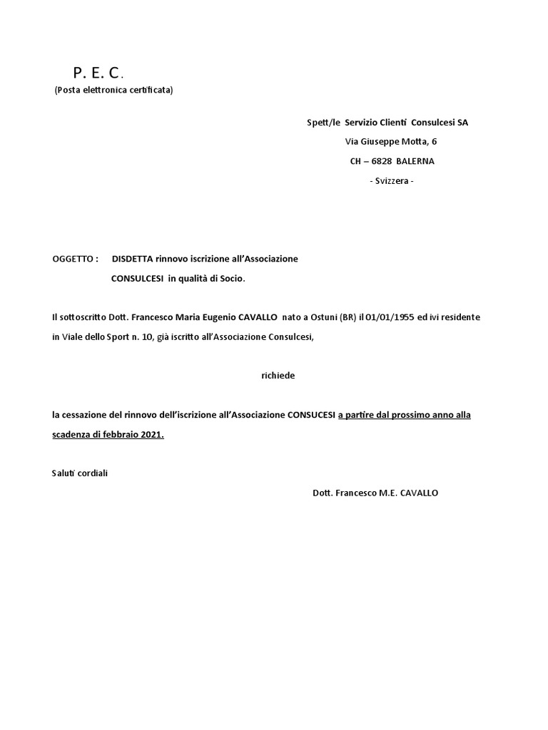 Fac-simile lettera di disdetta associazione e pagamento del ... Apr 09, 2014 · Con la presente il sottoscritto (Cognome, Nome, Data Nascita, Residenza, Cap, Città, Prov) presenta formale disdetta dal rapporto associativo con la Confederazione in indirizzo. Richiede, in riferimento a ciò, la cancellazione del proprio nominativo dagli archivi dell’Associazione e richiede dalla data odierna di essere, inoltre, cancellato ... Come cancellarsi dalla Confartigianato: un fac simile Dec 13, 2015 · Fac-simile lettera di disdetta partecipazione al corso di formazione; Fac-simile lettera di disdetta associazione e pagamento del contributo associativo confesercenti; Fac-simile lettera di disdetta contratto di fornitura; Fac-simile lettera di disdetta acquisto auto associarsi a confartigianato - Confartigianato Imprese Sì, sono interessato ad associarmi a Confartigianato Imprese. Vi prego di farmi contattare dalla mia sede territoriale più vicina, per conoscere più a fondo e senza impegno tutti i vantaggi di cui potrebbe beneficiare la mia impresa o le mie attività. Compila i campi del modulo: sarai contattato al più presto!