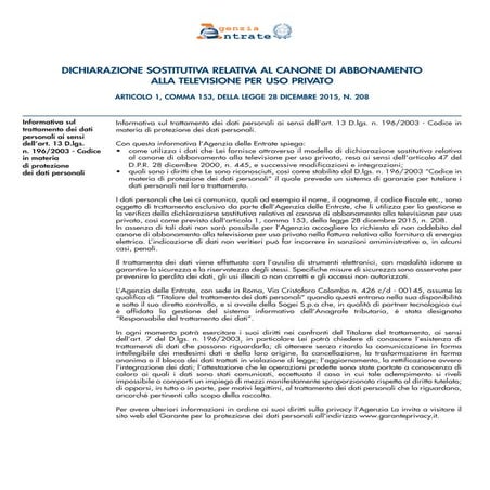 Esenzione Canone Rai 2023: il Modulo da inviare e ... Esenzione Canone Rai 2023: scarica, compila ed invia l'apposito modulo all'Agenzia delle Entrate se non sei tenuto a pagare il Canone Rai in bolletta. dichiarazione sostitutiva relativa al ... come utilizza i dati che Lei fornisce attraverso il modello di dichiarazione sostitutiva relativa al canone di abbonamento alla televisione per uso privato, ...