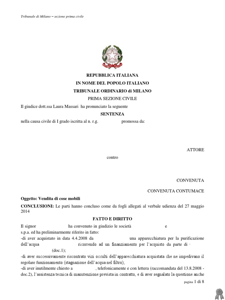 Vizi immobile dopo l'atto di compravendita: che fare - La Legge per Tutti Il compratore deve denunciare i vizi del bene comprato entro 8 giorni, decorrenti: per i vizi apparenti: dal giorno in cui l'acquirente è stato in grado di esaminare l'immobile, vale a dire, di regola dal giorno in cui questo gli è stato consegnato; Lettera denuncia vizi immobile locato: risarcimento danni e inadempimento Fac simile denuncia vizi occulti immobile, ecco il fac simile già pronto. Ora caro inquilino hai due step che puoi percorrere. Primo: puoi scaricare il nostra fac simile denuncia vizi occulti. Il modello è stato da noi pensato e studiato per avere un effetto specifico. Vizi occulti o mancanza di qualità: quale termine devo osservare per ... La denuncia dei vizi occulti deve essere effettuata a pena di decadenza entro otto giorni dalla scoperta, salvo che il contratto non disponga diversamente. Di fondamentale importanza è il fatto che la denuncia non è necessaria nell'ipotesi in cui il venditore abbia riconosciuto l'esistenza dei vizi. Avv. Paolo Nesta - Lettera denuncia vizi della cosa venduta Con la presente, pertanto, il sottoscritto denuncia formalmente e ad ogni effetto di legge i vizi dell'elettrodomestico e chiede la sostituzione del medesimo entro e non oltre quindici giorni dal ricevimento della presente. In mancanza sarà costretto a far valere le proprie ragioni nelle competenti sedi giudiziarie.