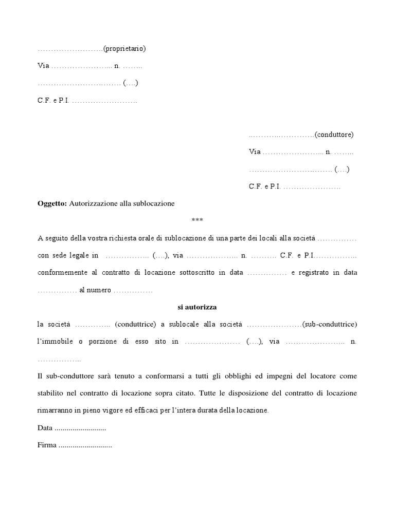Fac Simile Autorizzazione Uso Auto Aziendale per Fini di Servizio Esempio Autorizzazione Uso Auto Aziendale per Fini di Servizio In questa sezione viene mostrato un esempio di autorizzazione uso auto aziendale per fini di servizio editabile e compilabile. Si tratta di un esempio utile per chi ha la necessità di produrre un documento di questo tipo, visto che basta adattarlo per le proprie esigenze. Traduzione di "lettera di autorizzazione" in inglese - Reverso Context letter of authorisation letter of permission consent letter permission letter letter of consent I clienti devono fornire una lettera di autorizzazione formale. Customers should provide formal Letter of Authorization. Invio a SmartLine di una lettera di autorizzazione completa, accurata e sottoscritta richiesta autorizzazione/comunicazione per pubbliche ... AL COMANDANTE DEI VIGILI URBANI Egidio ... CHIEDE L'AUTORIZZAZIONE PER ... l'esonero del pagamento ai sensi dell'art.......lettera....del Regolamento.